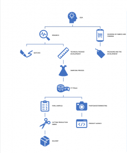اکنون درک خوبی از گزینه های موجود برای مدیریت توسعه دارید، اما واقعاً چگونه یک محصول را توسعه می دهید؟ برای رسیدن از ایده به پوشاک آماده فروش چه مراحلی وجود دارد؟ اجازه دهید با هم نگاهی کلی به روند داشته باشیم، درست است؟ این نمودار بالا یک جریان کلی از فرآیند توسعه محصول است.